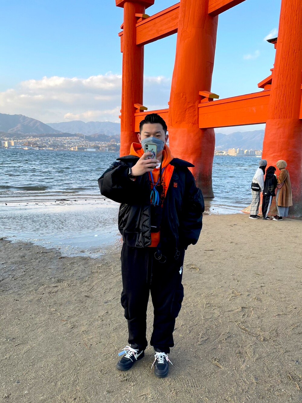 地元広島、厳島神社。 大親友と初詣。 パーカーとバッグ以外は父からの借り物。