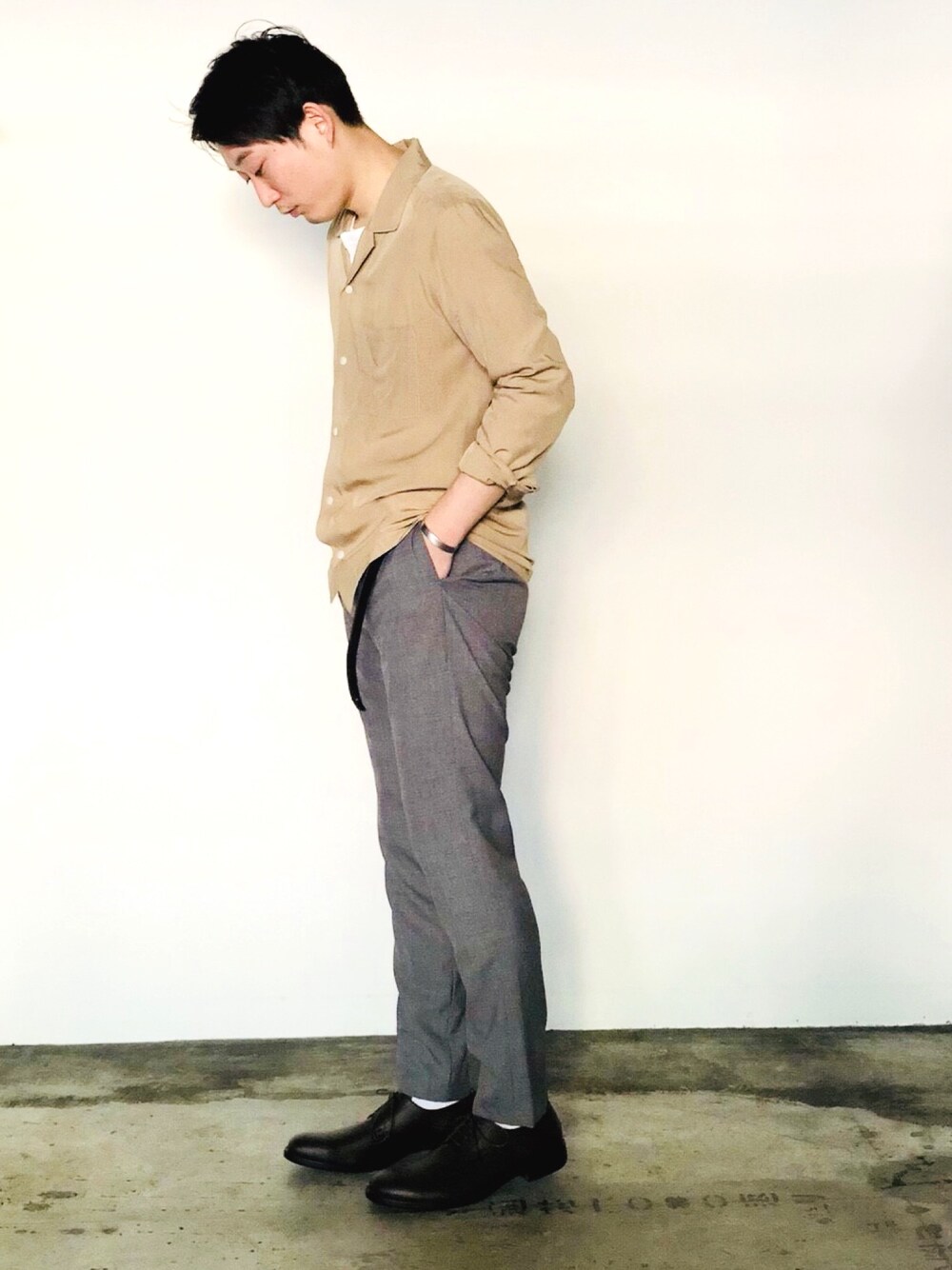 春らしいベージュのオープンカラーを使用したコーデ! スラックス合わせでキレイめにコーデしました! 小物でちょっとしたアクセントつけてます。