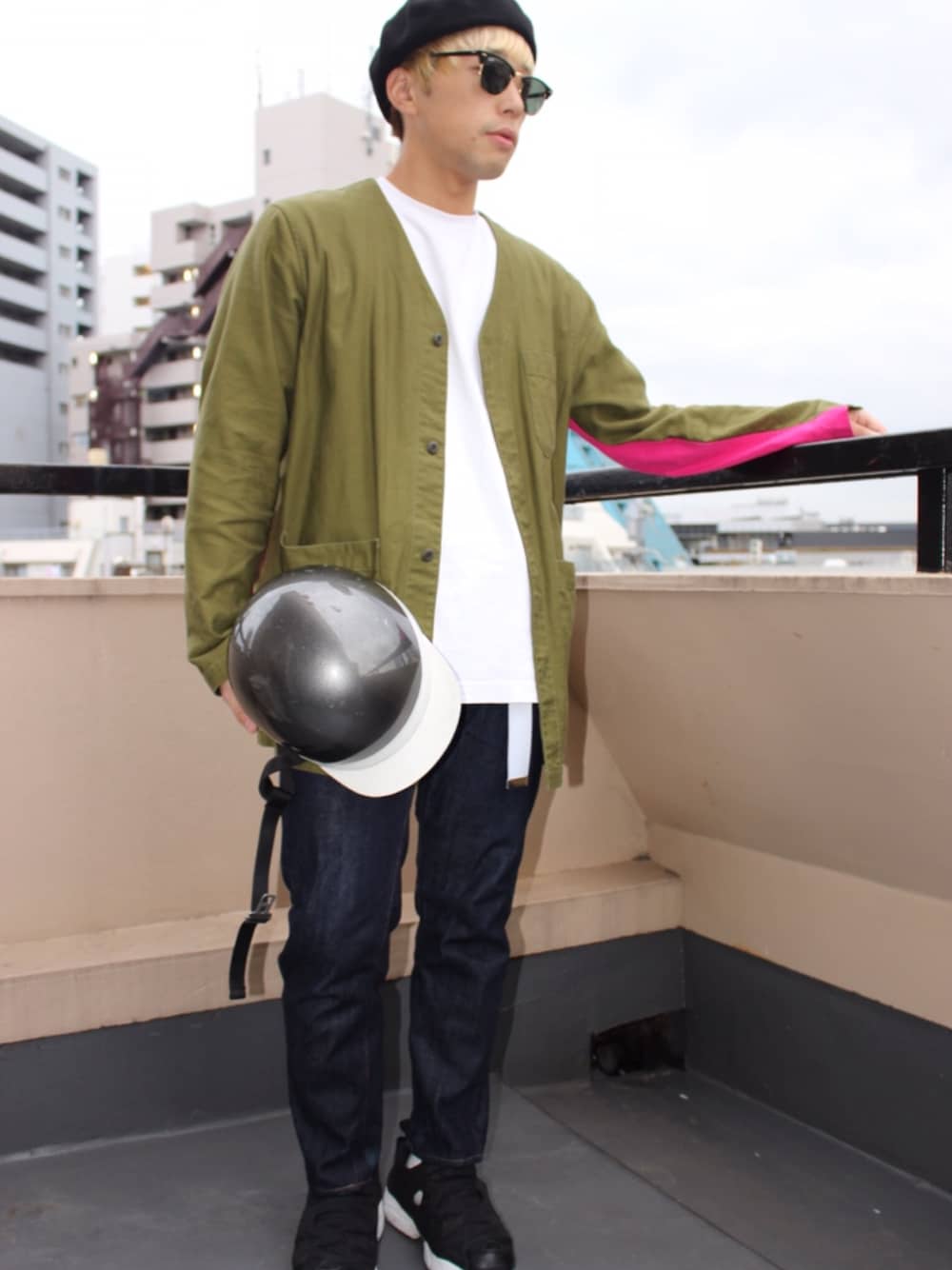 ノーカラーのミリタリージャケット×デニムのコーデ🤘 ジャケットは分かりにくいですが、ピンクの切返しになっていてカワイイです😘 ベレー帽も秋に向けて大活躍しそうです!