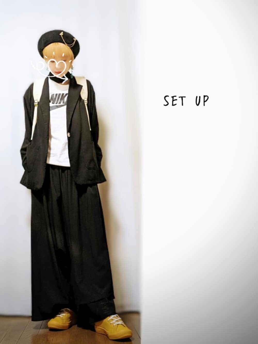 🤍🖤 +💛 ホワイト‘ NIKEロゴT + ブラック‘シアーテーラードジャケット + ブラック‘ガウチョパンツ + イエロー‘ CONVERSE サラサラ素材が快適な春夏のセットアップコーデ♡