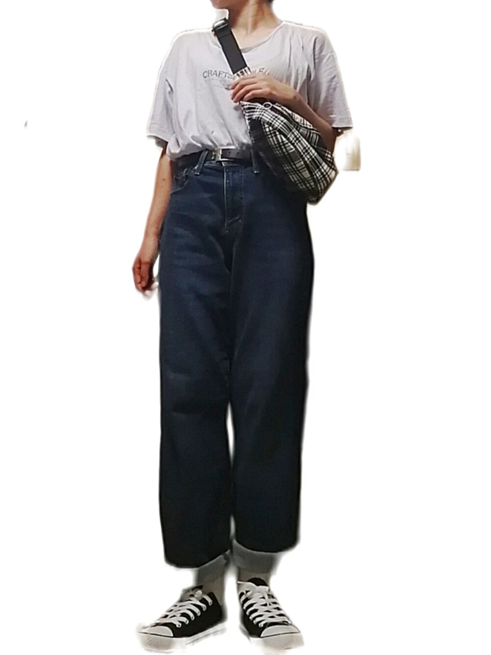 淡いパープルのトップスにデニムパンツを合わせて、他のアイテムはモノトーンにしました。