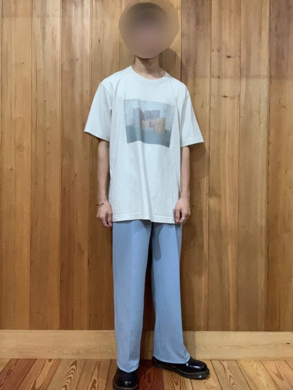 シンプルコーデ❗️ シンプルだけど水色のパンツで個性をプラス