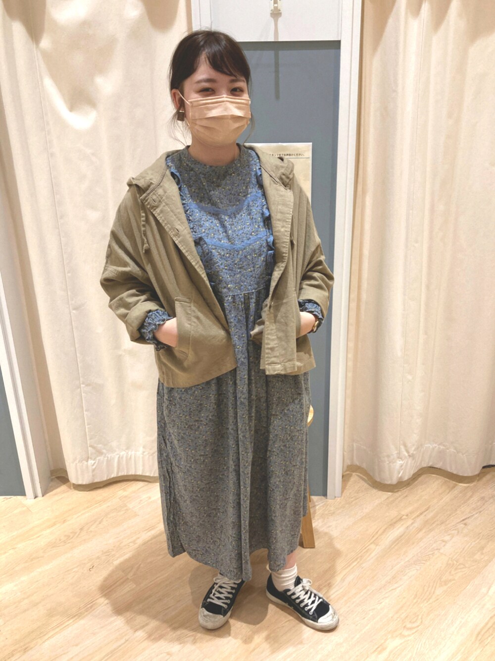 今回はカタログ掲載のワンピースを着用しております! 小花柄プリントが可愛らしく、かつ色味が落ち着いてるので可愛くなりすぎず着ていただけます🌷 フードジャケットとスニーカー合わせでカジュアルダウンしてみました🙋♀️