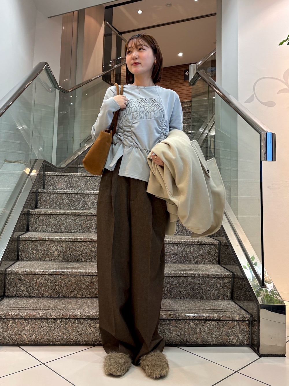 ご覧いただきありがとうございます! KBFソラリアプラザ福岡店のユウリです! 「寒いけど春服も早く着たい!」そんな方はカラーで春を取り入れてみるのもオススメです♩ 流行りのブルーとブラウンで淡色コーデを組みました🪺 是非参考にしていただけると嬉しいです⭐︎