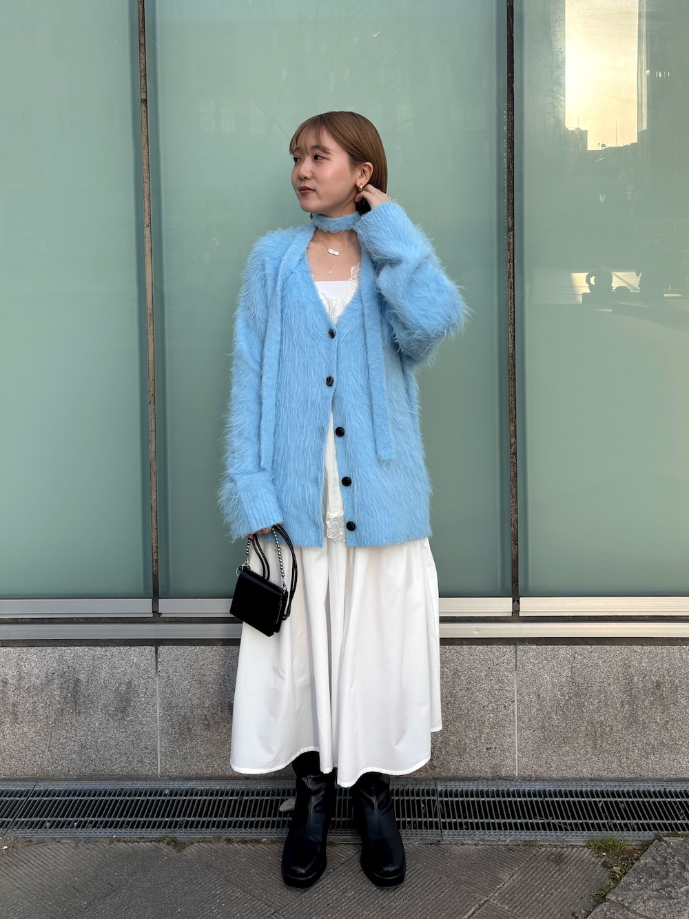 ご覧いただきありがとうございます! KBFソラリアプラザ福岡店のユウリです! シャギーカーディガンは冬っぽいですが、レースや白のスカートと合わせることで春っぽ冬コーディネートを組んでみました🫧 是非参考にしていただけると嬉しいです☆彡