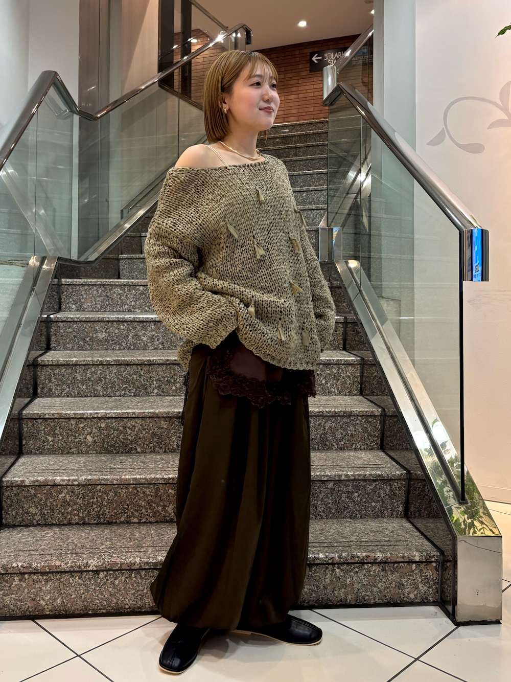 ご覧いただきありがとうございます! KBFソラリアプラザ福岡店のユウリです! アースカラーのニットをワンショルで着用して大人っぽ一癖コーデを組みました🫶🏻 バレンタインも意識してリボンやブラウンのレースで可愛らしさもだしつつ、サテンパンツやフラットシューズで抜け感も出ます🍃 是非参考にしていただけると嬉しいです!