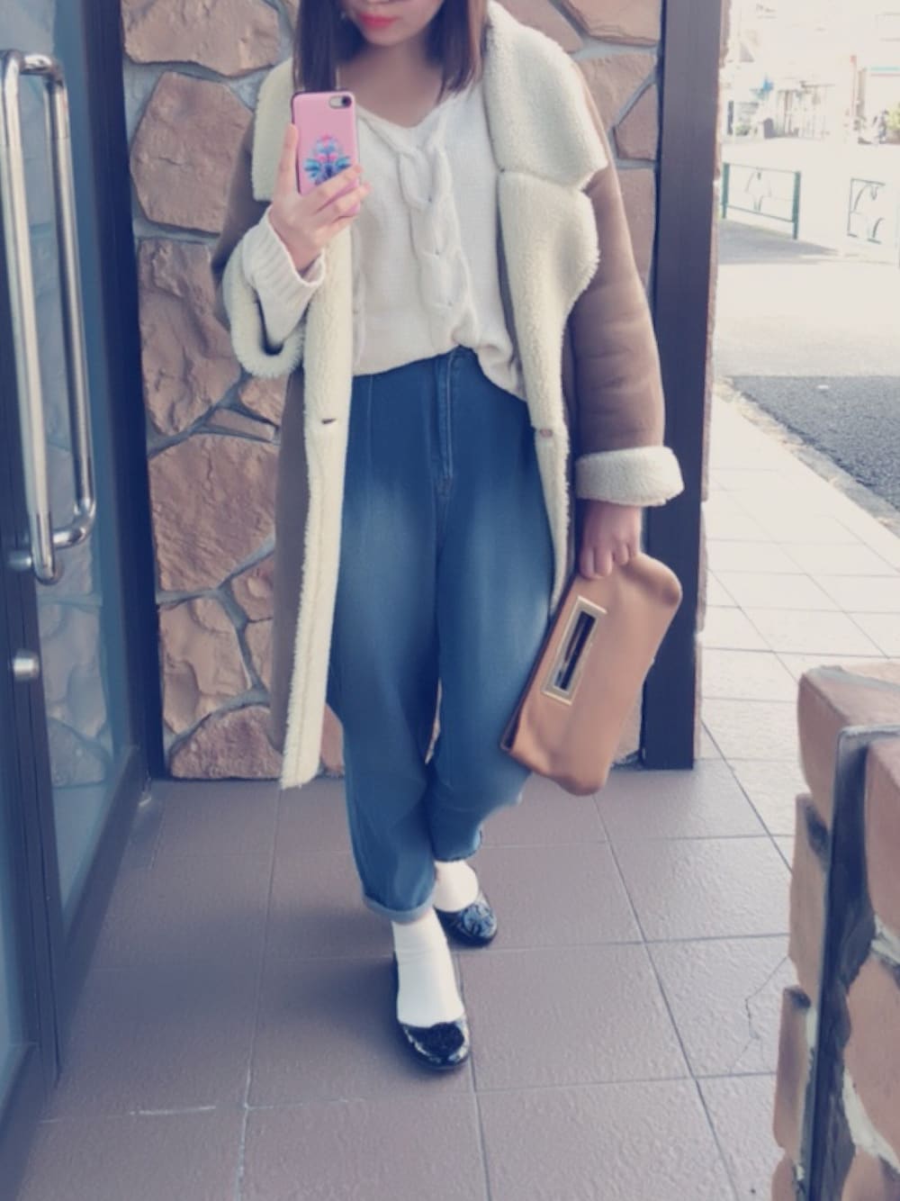 ⑅◡̈* こんにちは! 今日は暖かくて過ごしやすいですね😆 今日のコーデは ムートンコート もこもこニット GUのデニムパンツです! 白靴下に黒パンプス合わせました😊 マフラーいらずで嬉しい😊✨ ⑅◡̈*