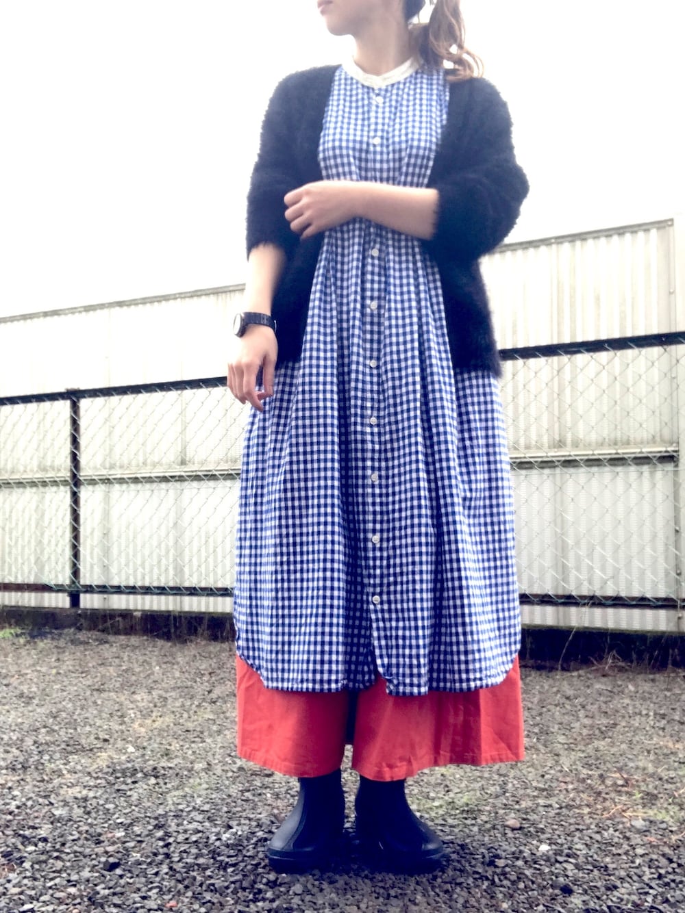 雨靴はショートタイプ。 さっと履けて便利。 足だけ黒いからカーディガン羽織ってみました。