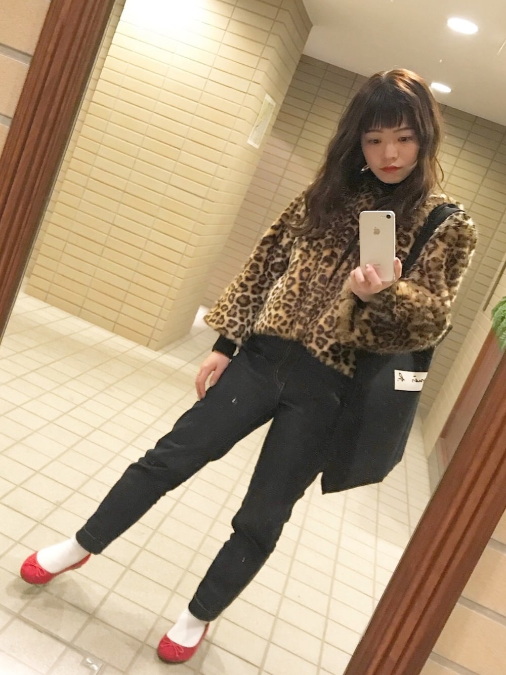 . . 今日のコーデはお気に入り🐆❤️ バレエシューズにあわせてリップも真っ赤に💄 . Kastaneの配色ステッチデニムたいへん履き心地よき🙆♂️