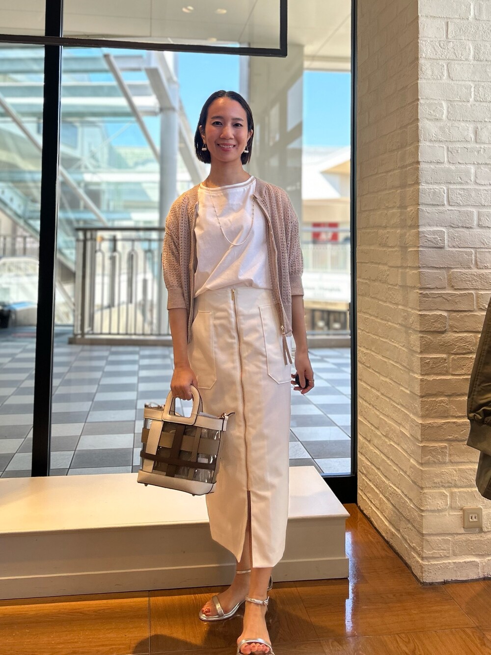 【ボディシェルフロントファスナースカート】 サラッとした肌触りですが生地感がしっかりとしていて裏地もついているので白でも透け感は気にならないです✨ 普段使いからオフィス使いまで幅広く使っていただけます🌷 【リブ部分シアー フレンチスリーブTシャツ】 首元腕周りのシアー感が可愛いTシャツはフレンチスリーブになっているので中に着てもお袖が邪魔しないのでジャケットなどのインナーにもお使いいただいたりとオンオフ問わず使えるTシャツです✨ 【透かし柄ジップカーディガン】 ジップカーディガンはキレイめコーデにも、カジュアルコーデにもよくあうので幅広いコーディネートができます🌷 裾がリブになっているので小柄な方にもコンパクトに着ていただけます✨