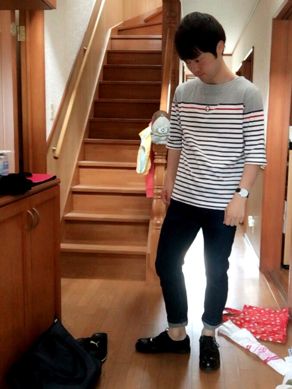 5分丈バスクシャツをさらりと1枚の、ただのシンプルコーデ 足元は安定のデニム&革靴
