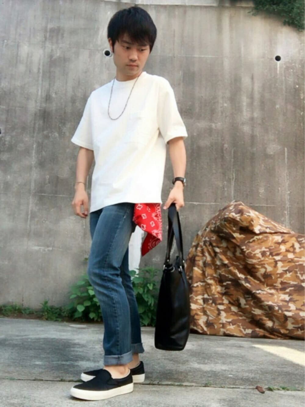〈サイズ〉 Tシャツ:M パンツ:36 シューズ:M ドロップショルダーTシャツを使用した、リラックスコーデ。 さりげないバンダナもポイント