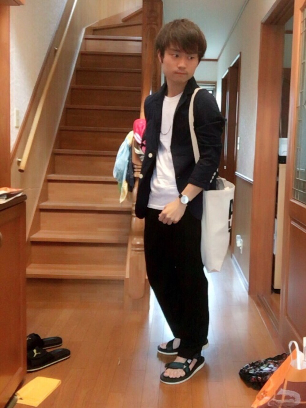 〈サイズ〉 ジャケット:S Tシャツ:M パンツ:M シューズ:26.5 シアサッカージャケット×ワイドスラックス×スイコック