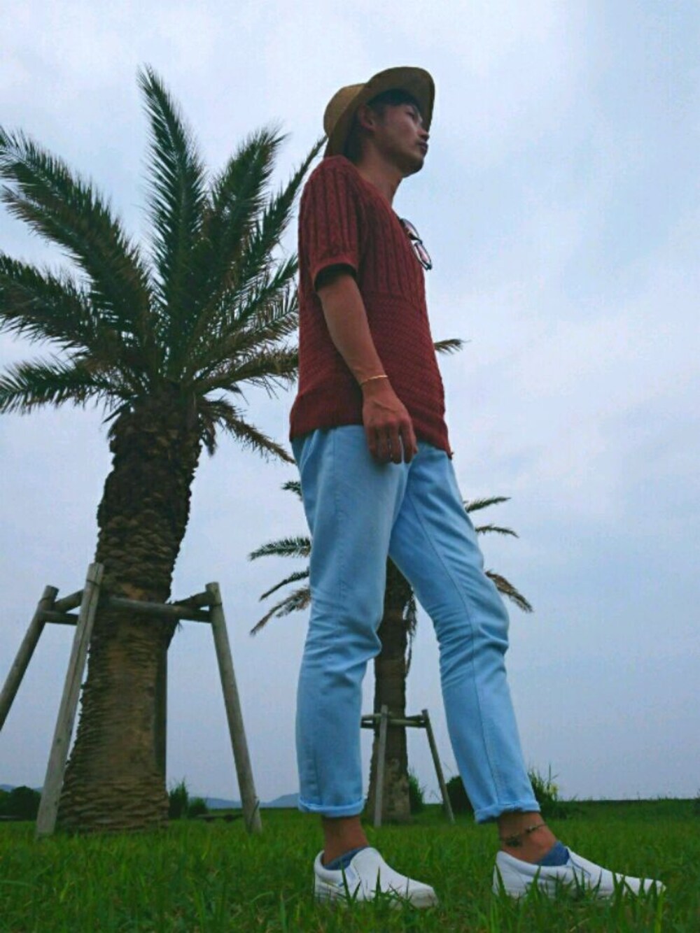 こんばんは😌 連日蒸し暑いので、散歩するにも一苦労してます😅 皆さん、水分・塩分補給をしっかりとし、やがて来る本格的な夏を楽しみましょうね🌴🌊🎆🌺🍧🍉👙 今日のコーデは、久しぶりにスリッポン履きたくなったので、VANSを👟 白×白のチェッカーフラッグで、控えめな所がお気に入り🎵 サマーニットは、RAGEBLUEので、レイヤードはしませんでした😊 アイスブルーのパンツは、nano・universe別注Leeのアンクルパンツ👍 先日のタイムセールで購入した、ゴールドの華奢なバングルは、VIBGYORのモノを早速✨ このバングルは、女性にも合いそうですね😉 アンクレットは、安定のBEAMS😏 ストローハットは、いつものGUです🙋