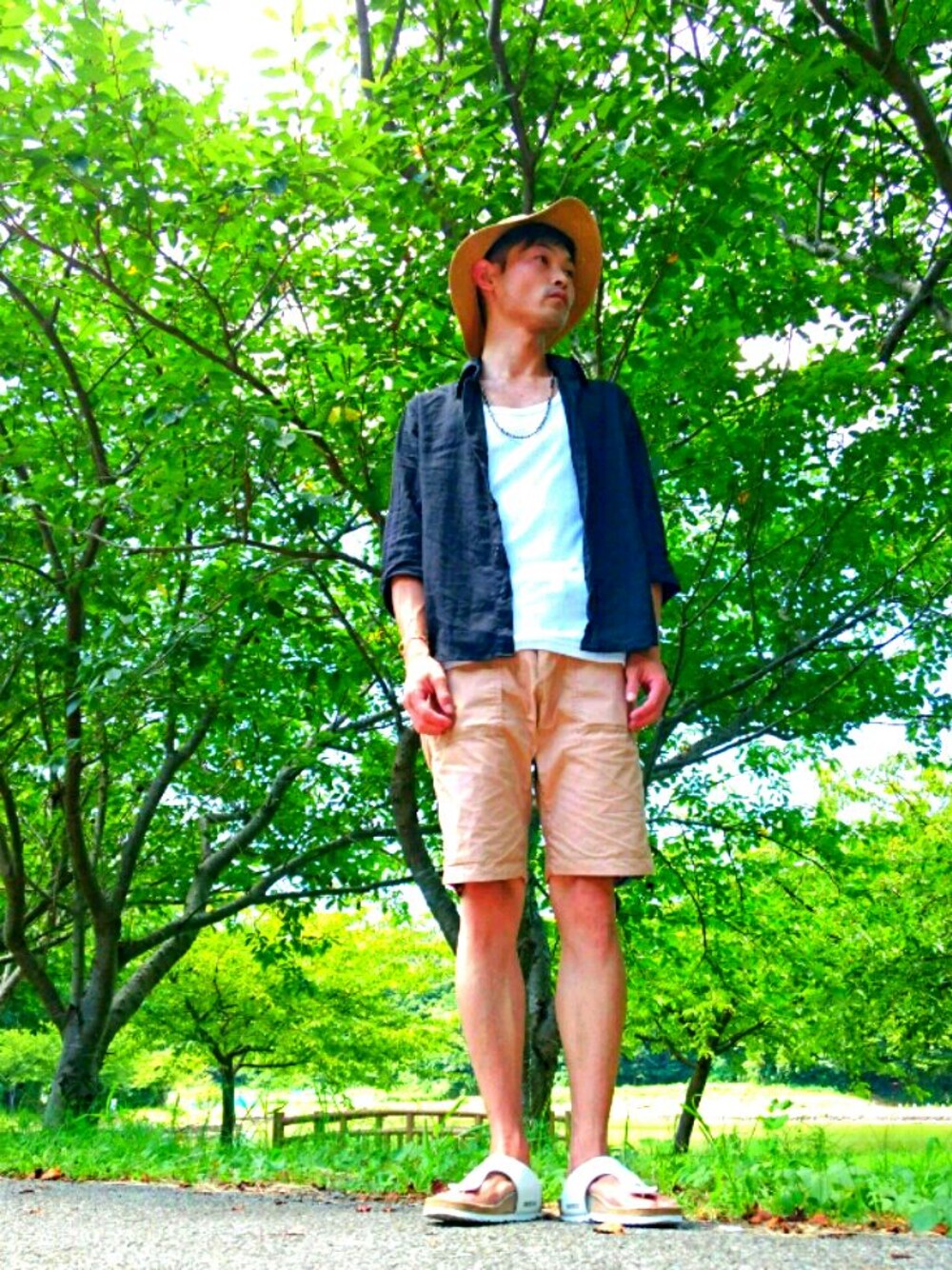 こんにちは😃 梅雨明けし、世間は一気に夏モードに入った感がありますが、体調管理にお気をつけ下さい😌 今日は、近くの公園?に来てます🍀 コーデは、LHPのショートパンツを軸に、ユニクロのタンクトップとネットで購入した、黒のリネンシャツを合わせてみました😊 ベージュ+ブラック+ホワイトで夏コーデ🌴 GUのストローハットは、クタっと感が俺好み🎵 ビルケンシュトックのサンダルは、履き心地良し❗ いつも付けてるBEAMSのアンクレットは、今日はお休み💤 相変わらず、VIBGYORのバングルはヘビロテ✨ このコーデなら、海でも良いかも🌊 海水浴したいけど、今日も仕事が。。 小窓に、別ショットと、オクラの花載せましたので、宜しければご覧下さい😌