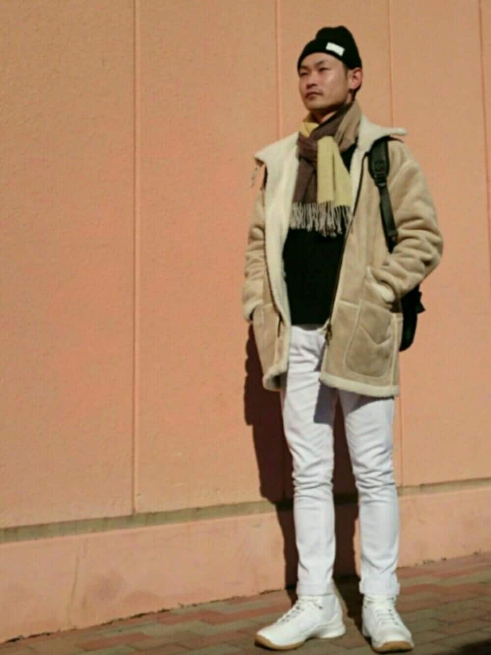 おはようございます😊 今日は、ムートンコートをメインに、ベージュ・ブラック・ホワイトで纏めたコーデです😌 VIBGYORのムートンコートは、見た目より軽くて、お気に入りです✨ スタイルが良く見える様、パンツとスニーカーをホワイトで纏め、Vラインを意識してオーバーサイズのアウターを羽織りました🙋 全体の色合いを見て、マフラーもベージュ系に🎵 巻き方は何時もと一緒です😁