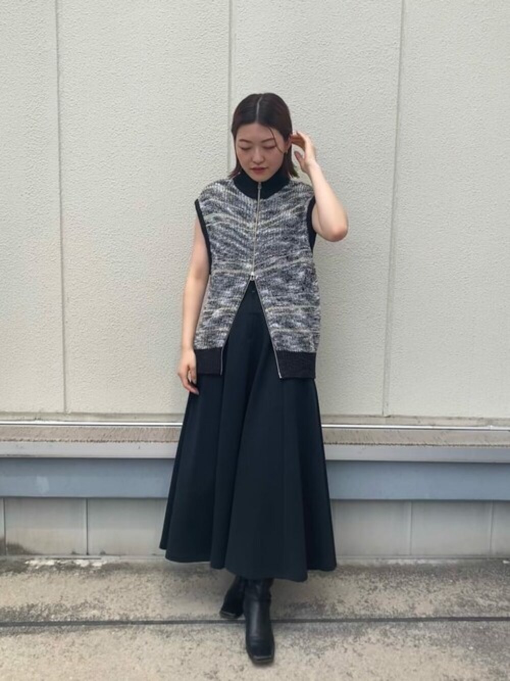 上下どちらからもジップが開けられます。ウエストにポイントのあるスカートなので少し下のジップを開けてスタイリングしました。インナー次第でオールシーズン着用可能です。
