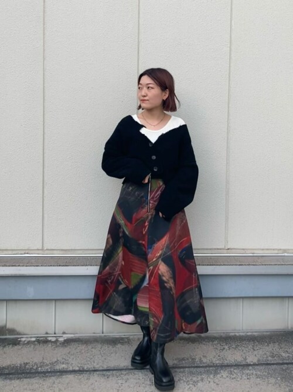 ショート丈にハイウエストのスカートでスタイルアップコーデをしました。袖はゆったりしているのでこれからの時期厚めのニットも着用可能です。襟と裾のブロークン加工がかっこよく着られます。