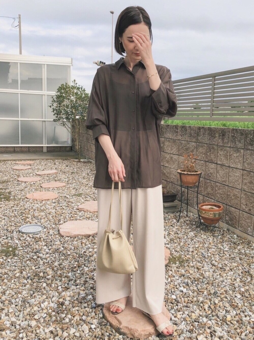 風が涼しくて夏×秋コーデ🌱 シアーシャツは深みがあるブラウンで 大人っぽい印象に𓀤𓂃𓈒𓂂 select MOCAさんのパンツは楽で 合わせやすいから毎年愛用♡