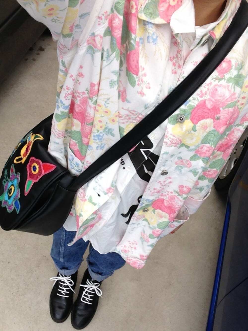 台風きてるけど、 花柄ハッピー野郎だった⊂((・x・))⊃ この鞄持ってることすっかり忘れてた、 おっとっと。 中に着るのシンプルなぴったりサイズが良かったんだけど、派手でだるだるのばっかりしか持ってなくてちょっと反省。 来週仕入かな〜 友達と晩ご飯行く予定だったけど、 台風がきてたのでランチに変更して 早め解散(・ω・)ノ