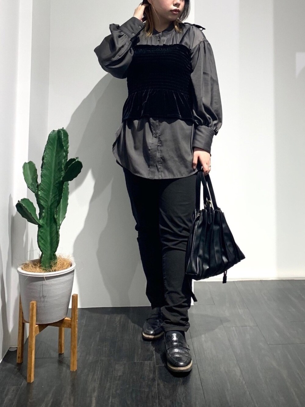 お気に入りのブラウス×新作のベロアビスチェ☻ ビスチェ苦手だけどこれは長さを調整できて使いやすそう!!