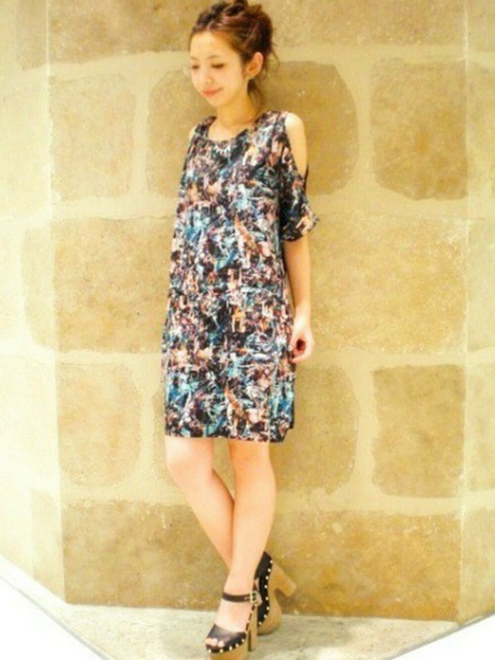 トレンドの肌見せ肩あきワンピがアパートバイローリーズにも登場! 肩あきと柄がポイントなので1枚でサラリと着るのがオススメ♪
