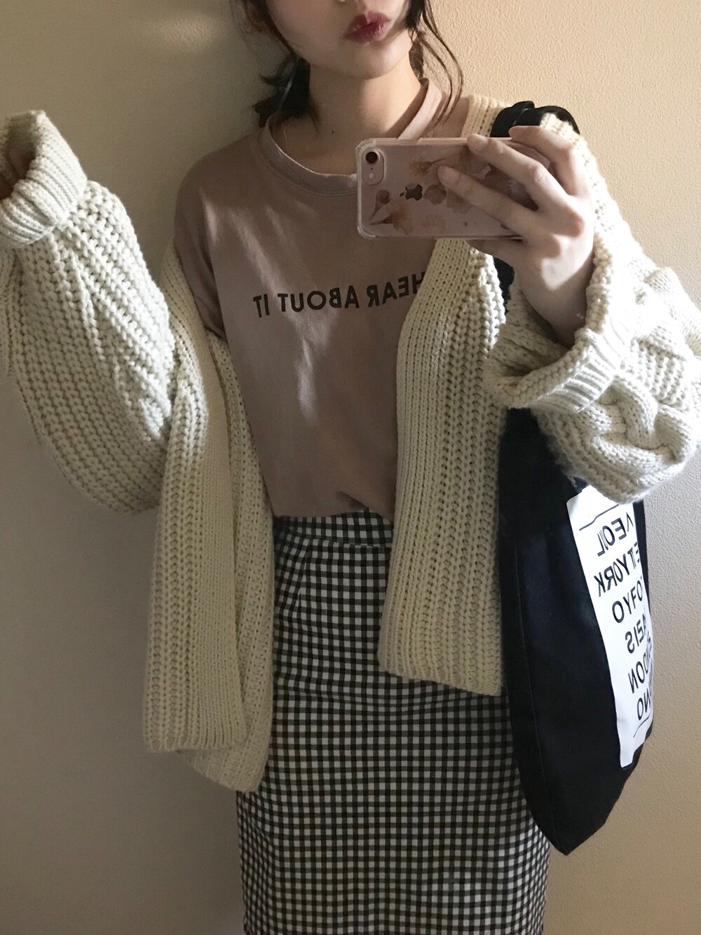 (最近このスカート率高い) 今日はまあまああったかかったから中はTシャツ👕でカーディガン羽織ったよ〜 厚めでたぼっとするからお気に入り♥︎ スカートの丈などの感じは他の投稿見てください😘