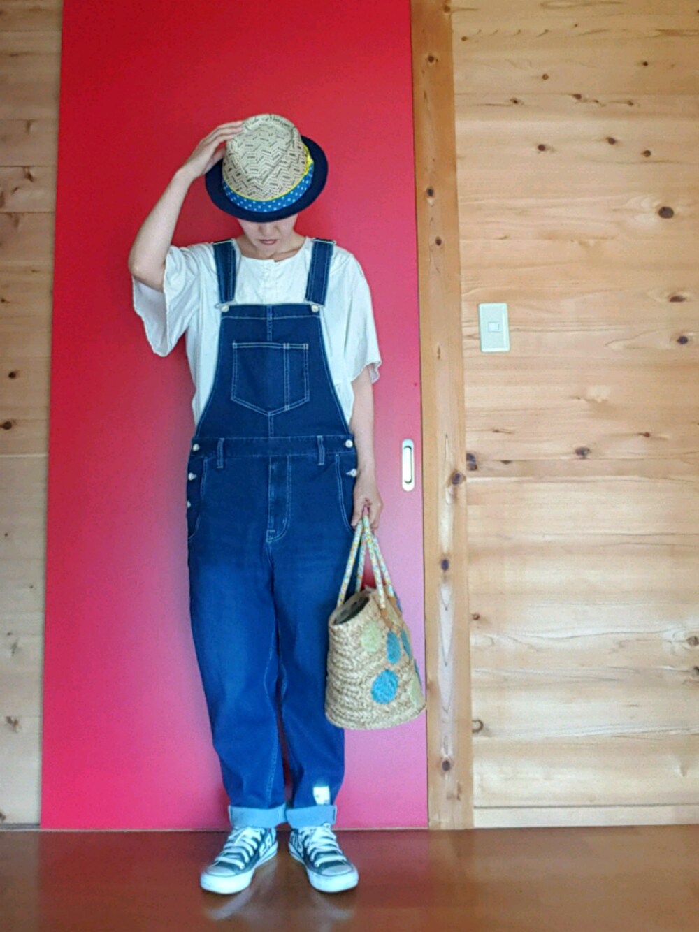 yoshiのデニムパンツ「FRAPBOIS halfフラセット ◆Tシャツ&サロペットset」を使ったコーディネート