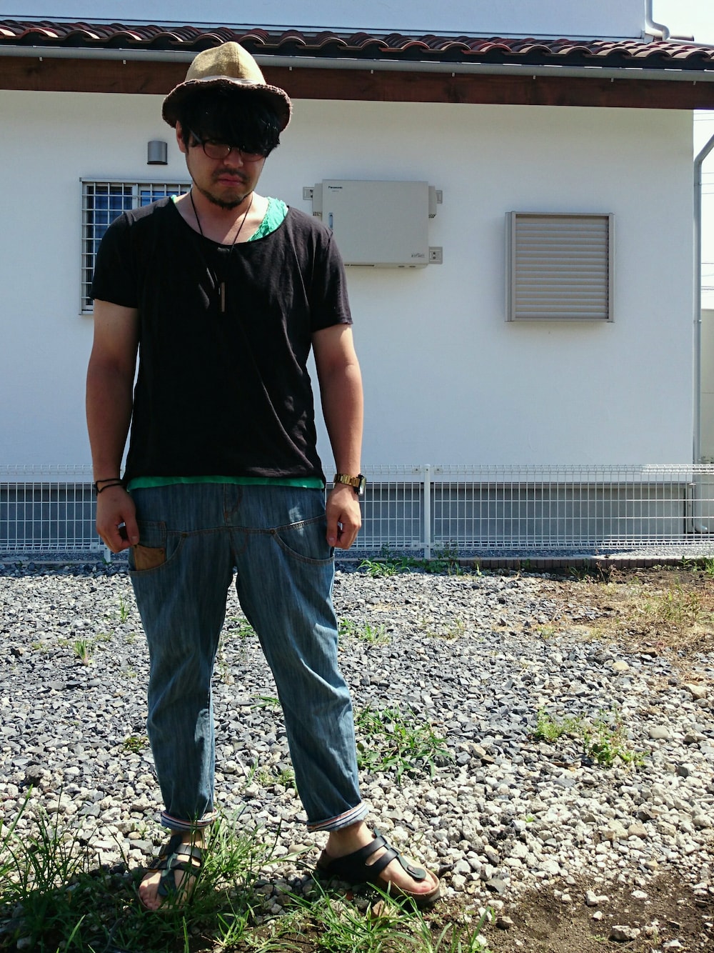 ゆったりシルエットのパンツにH&Mの無地Tです。 差し色で中に緑色のタンクトップを着てのレイヤードスタイルにしました。 サンダルも色味をあわせて、黒、緑、黄色の三色カラーなんですけど、写真じゃ全くわかりませんね💦