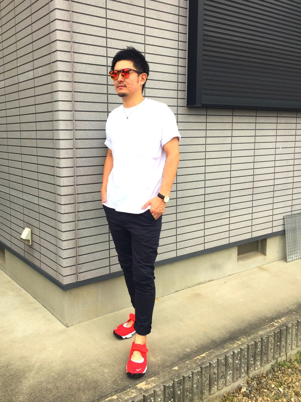 今日も赤のエアリフトでのコーデです! 靴にインパクトあるので、トップスとパンツはシンプルにしてみました。
