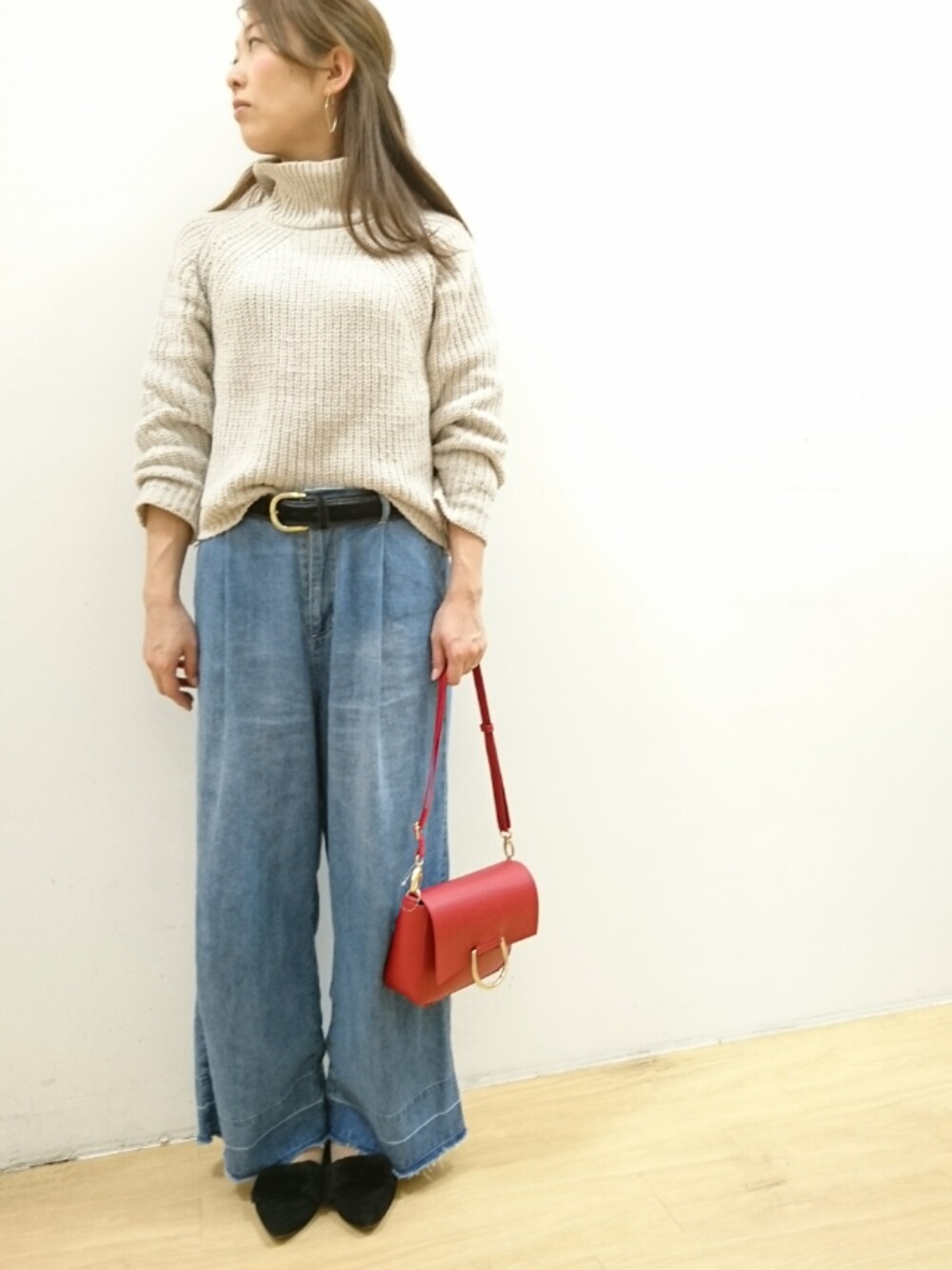 秋通り越したのでしょうか? モールヤーンのざっくりニットでも 良いくらい🙌◎ 丈は長くないけれど、前だけちょこんと 入れた方がやっぱりスッキリ見えます✨ シンプルコーデに赤バッグがポイントです♪