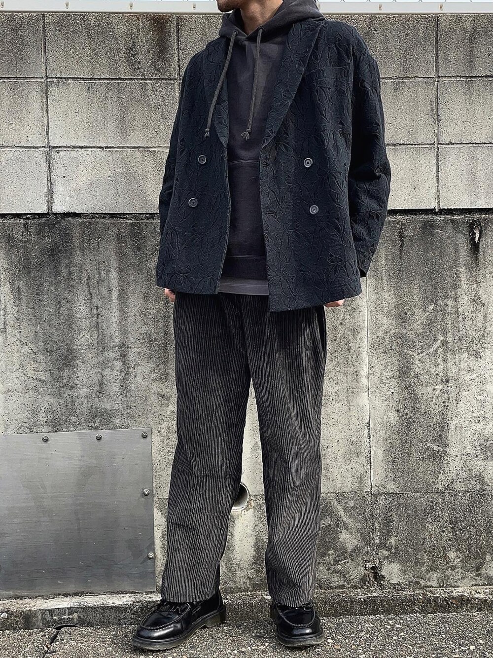 黒男のテーラードジャケット「《ユニセックスアイテム》リーフレースプライムオーバーダブルテーラードジャケット【MAISON SPECIAL/メゾンスペシャル】」を使ったコーディネート