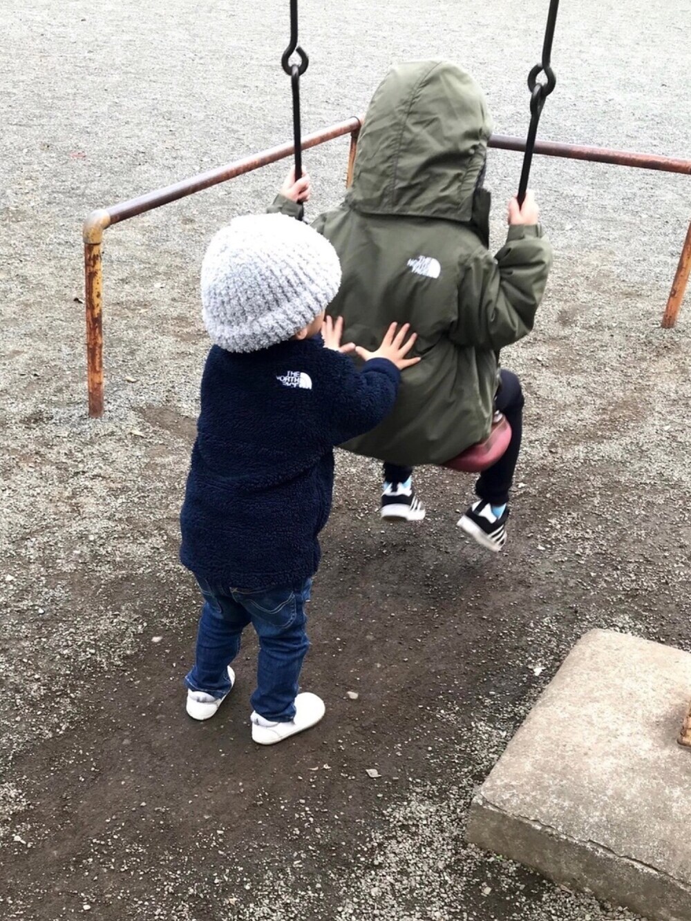 Daughter 114cm21kg アウター130cm ボトムス130cm son 91cm13.3kg アウター110cm ボトムス95cm 2度目の姉と一緒♡ 高くなるまで押してあげるんだって、がんばってた☺︎ 姉は水色が大好きで、服に合わない靴下を履いちゃってます笑 差し色か!爆