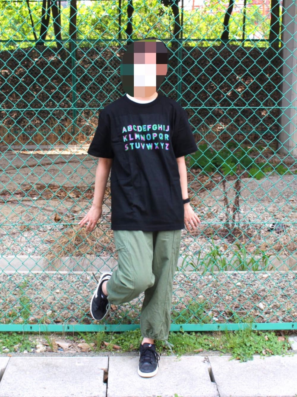 ネオンで表現されたアルファベットTシャツ(黒)を使用したコーデになります。 今回はオープニングモデルをK.Rさんが務めてくださいました。 カーゴパンツとの相性がよく流行にとらわれないコーデになりました。