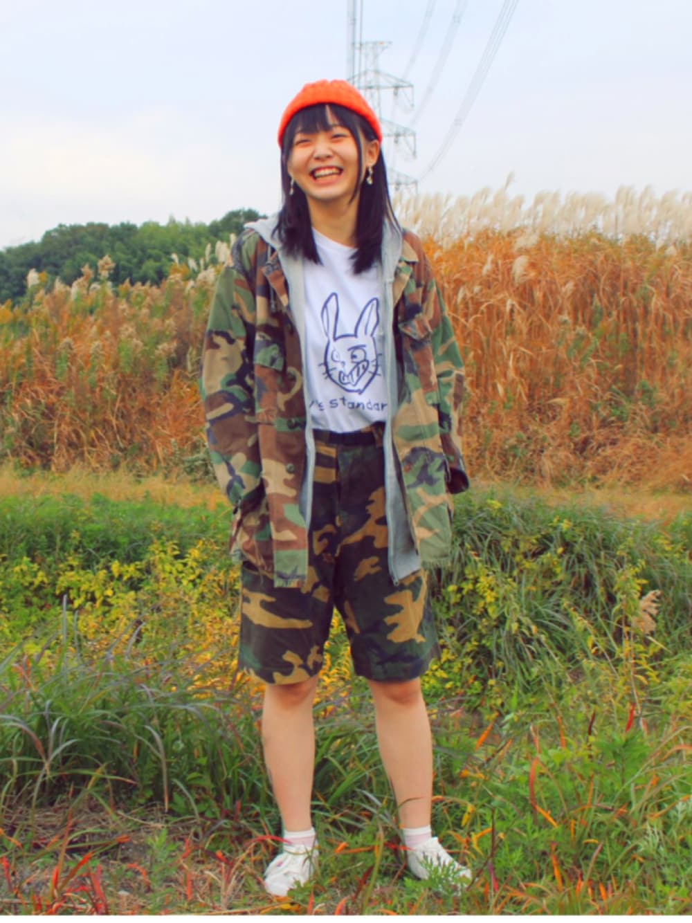 先日のモデルさんの一枚。 迷彩のセットアップは女性でも着られることがよく分かるコーデになりました。 ひょっこり顔出すY's うさぎがポイントになってて可愛いですね。