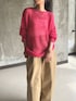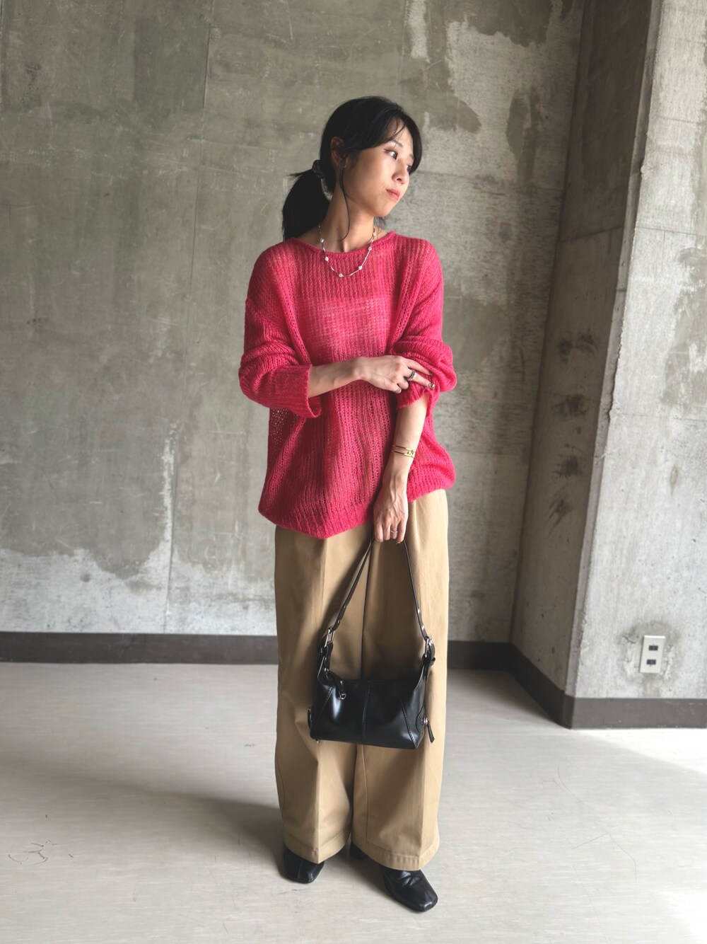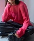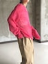 派手に見えるピンクだけど シアーだから着ると馴染む◎ ピンクニットを主役にしてチノパンに小物はブラック 大きめだからざっくり着れる感じもすき!