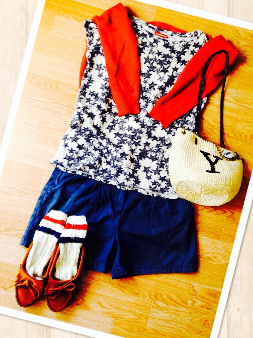 カットソー☆UNIQLO カーディガン☆INGNI Sパンツ☆H&M かごバッグ☆ブランド不明 コテコテ青×赤コーデ♪