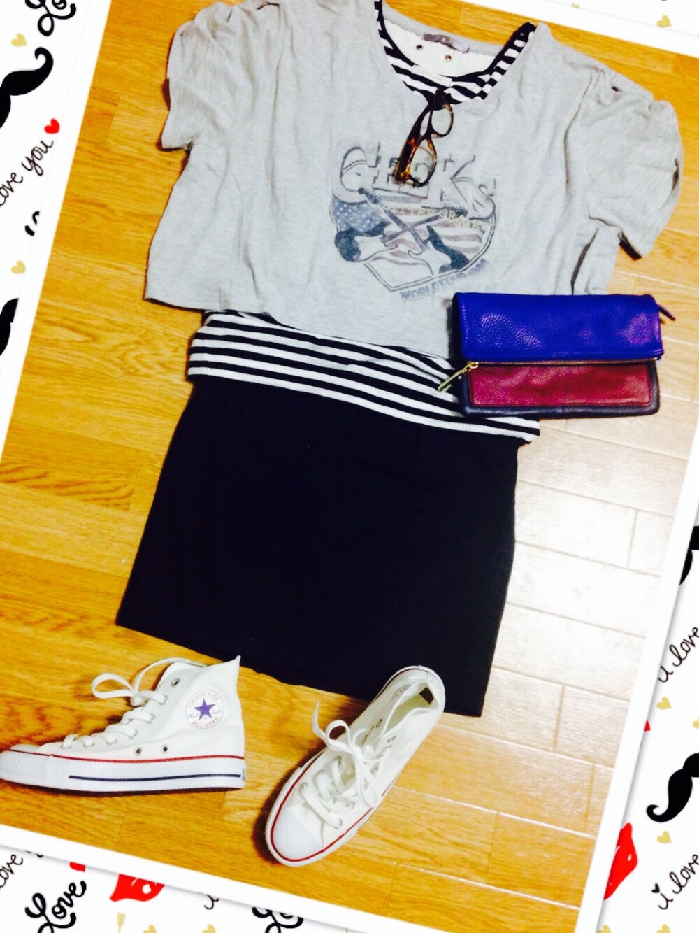 Tシャツ☆VIVA YOU タンクトップ☆ローリーズファーム スカート☆ナイスクラップ クラッチバッグ☆GAP 悩みに悩んだ白いコンバース購入‼︎ 汚れが気になるけど、やっぱりカワイイ♡
