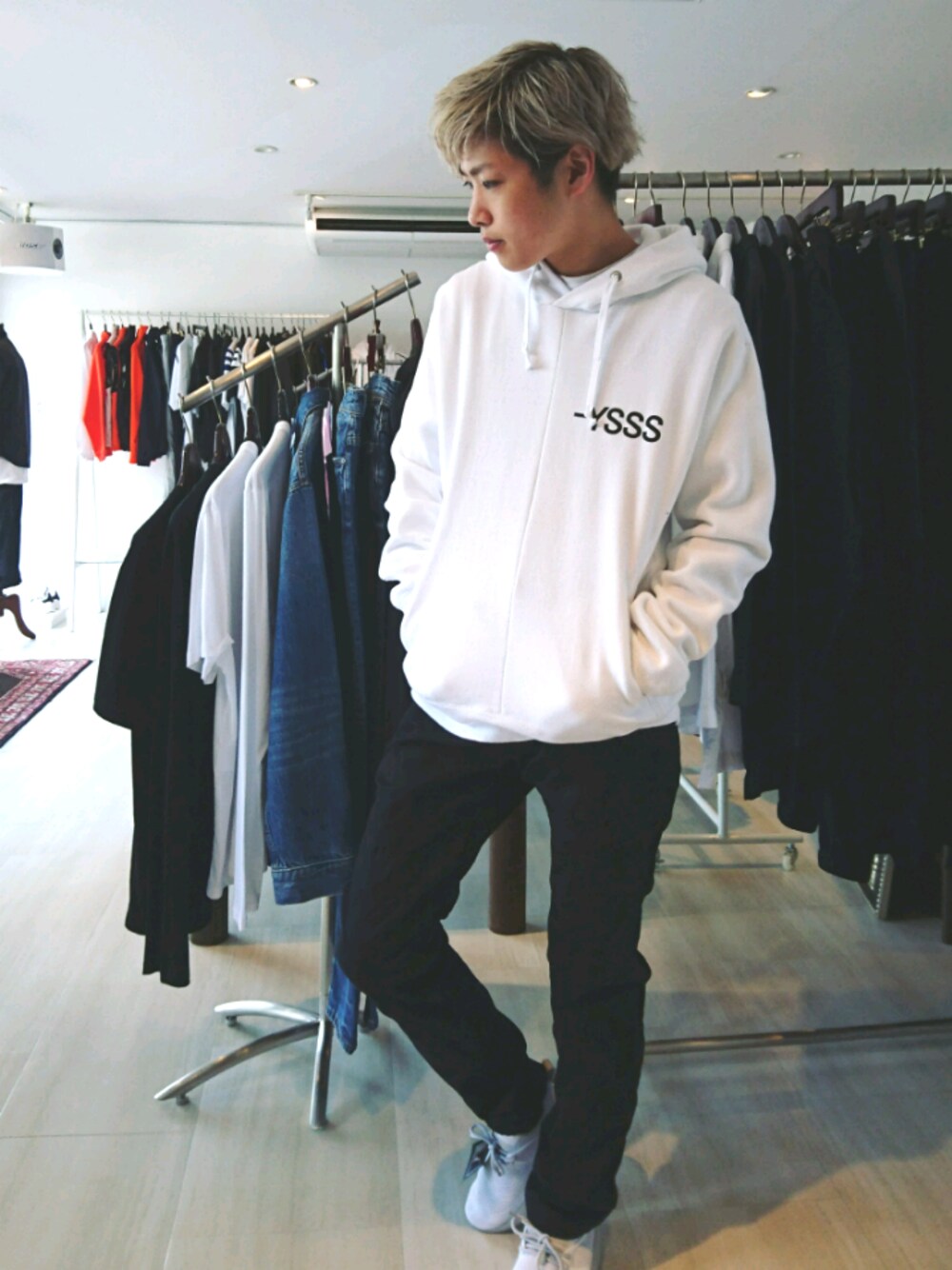 BLUEY コーディネート! ホワイトのパーカーは春夏に映えますね! 身頃ぼ中心に縫い目があるのが特徴です! ポケットは内側に入れ込んであるデザインになっています。 少しオーバーサイズに作られていて今のトレンドにも非常に合うデザインですね!