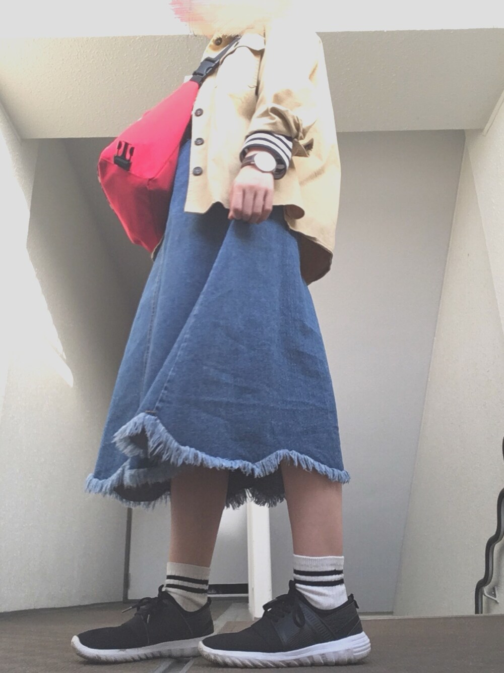 hiyokoのデニムスカート「スカラップフリンジヘムデニムフレアスカート615-9527」を使ったコーディネート