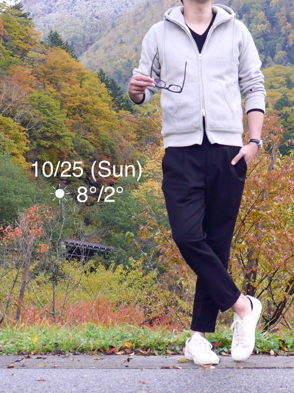 うーん。旅行にはスニーカーで行きたいなぁと思いながら慌てて用意したら金曜日とほぼ同じ格好になり、そして何より、厚手のパーカーの中にウルトラライトダウン着てますが、まぁ寒い。。まだ東京は秋なので撮影用に腕まくりはしたものの、このあとすぐ戻しました。笑