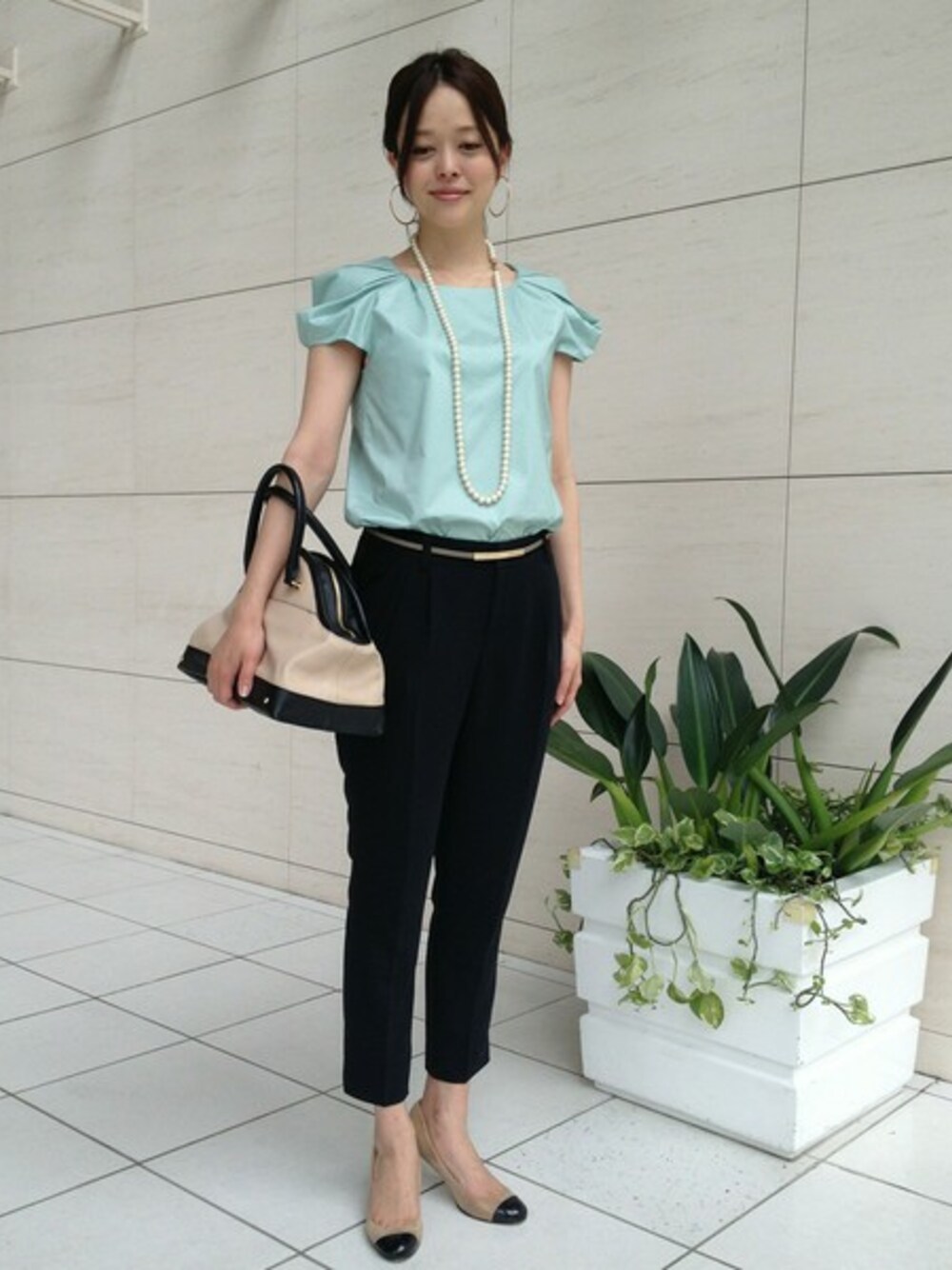 袖デザインがポイントのブラウスに、タック入りで履きやすいパンツを合わせたコーディネートです。