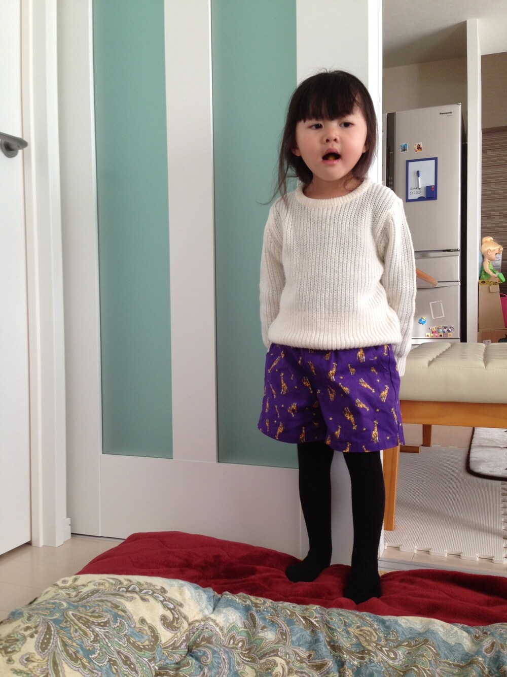 白ニットはH&MのキッズBOYコーナーで発掘♡ 見にくいけどズボンはキリンさん柄♡ 紫に黄色のキリンがステキ〜♡