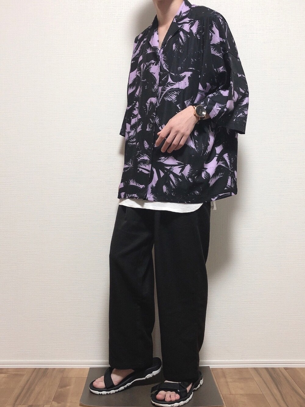 ご覧頂きありがとうございます😊 アロハシャツ×レイヤード×スラックス ザ・夏!って感じです 全体暗めなので レイヤードで白入れてサンダルにして 爽やかさ出しましたー🙆♀️ 大好きな、ゆるこーで👍 好きな人は好きなはず! ○サイズ○ ・シャツ F ・タンクトップ M ・パンツ S ・サンダル 26