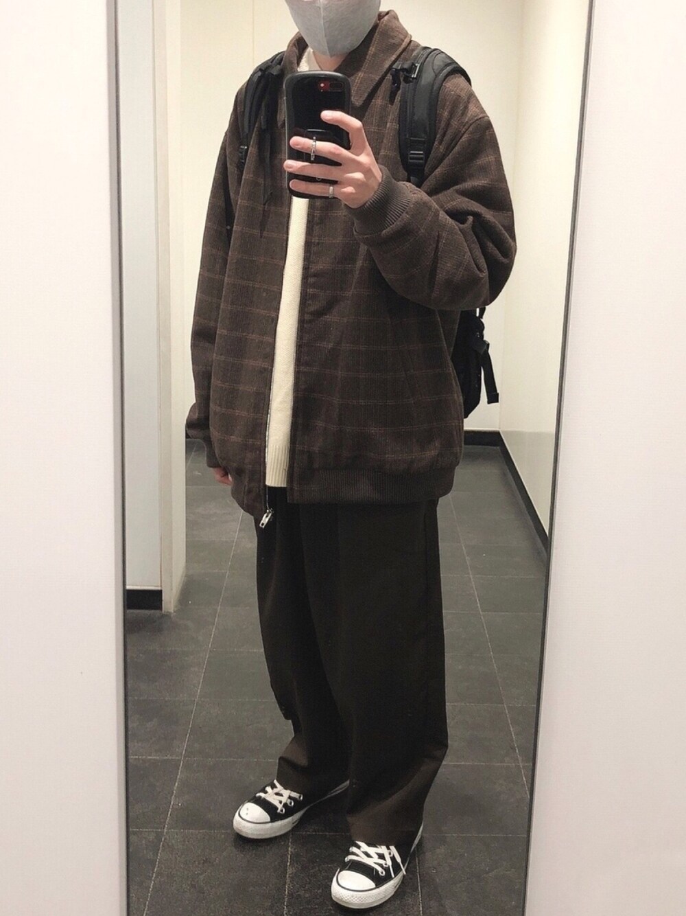 ご覧頂きありがとうございます🙆♀️ ブルゾン×ニット×スラックス 今回は外撮り! 今回はブラウン×ブラウンで合わせて 中に白ニットでバランスを取りました😊 ゆるいシルエットが たまらない😆 ○サイズ○ ・アウター L ・ニット M ・パンツ XS ・靴 26