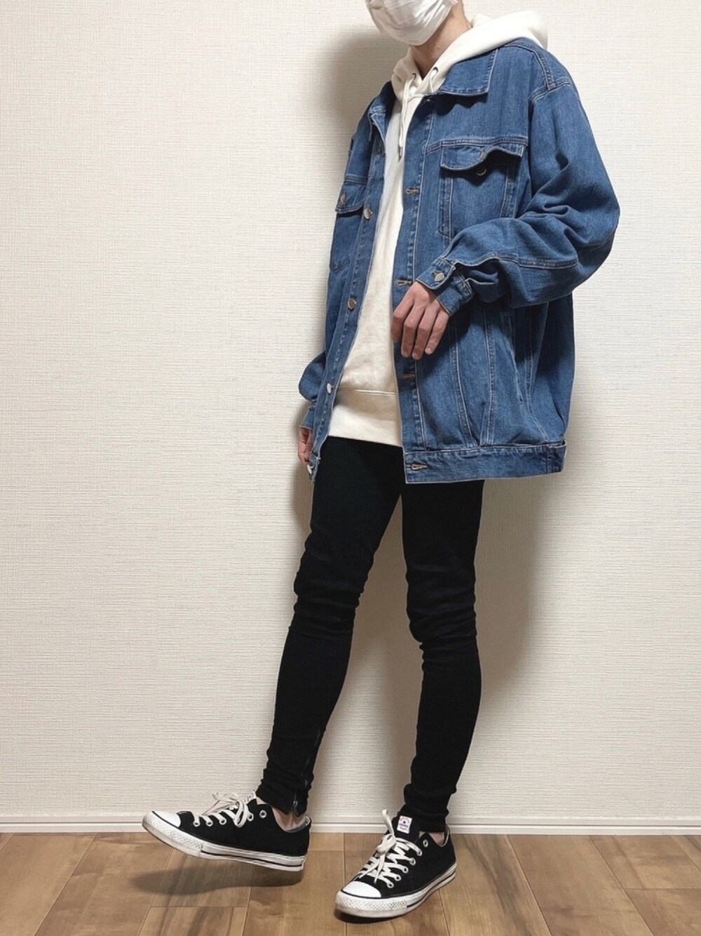 ご覧くださりありがとうございます🙆♀️ デニムジャケット×白パーカー×黒スキニー 定番のデニムジャケットコーデ♪ 春っぽい感じで好きですね😊 モノトーン+青は特に合う!! もちろん上はオーバーサイズで👍 ○サイズ○ ・アウター M ・パーカー L ・パンツ XS ・靴 26