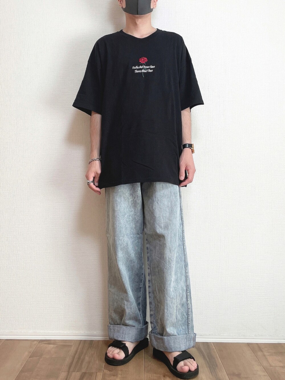 ご覧頂きありがとうございます😊 「カジュアル感強めの シンプルゆるコーデ」 Tシャツ= ×デニムでシンプルですが カジュアルめなコーデ! 黒Tシャツにすることで 少し引き締まるかと👌 、 ○サイズ○ ・Tシャツ L ・パンツ S ・サンダル 26