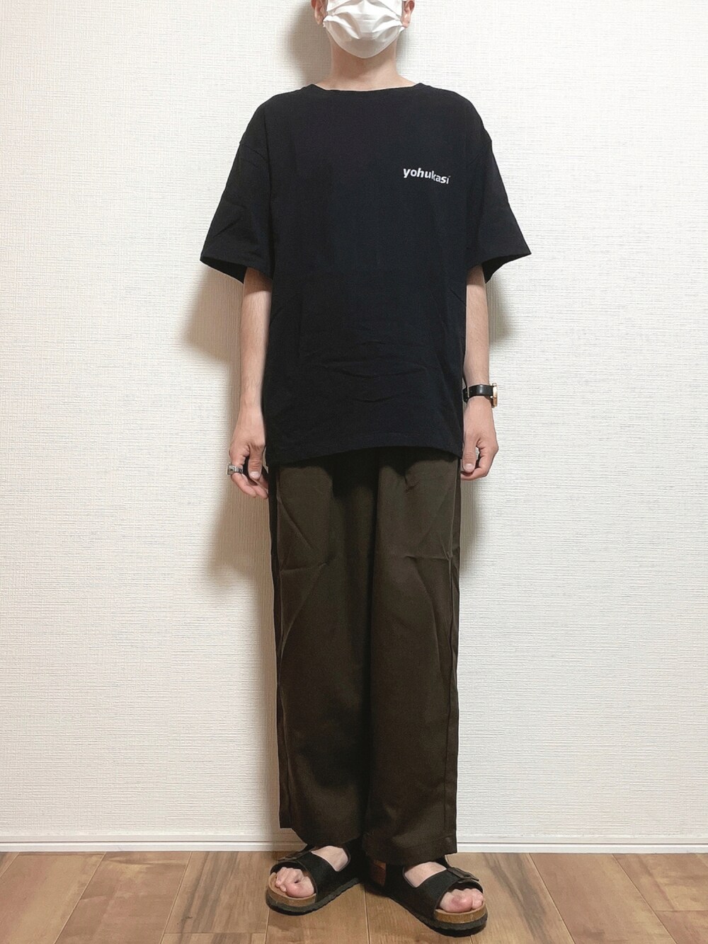 ご覧頂きありがとうございます😊 「カッコいい配色、ゆるいシルエット」 上下remerでコーデ! ブラック、ブラウン配色で かっこいい雰囲気に♪ 夏本番は 少し暑苦しかもです💦 ○サイズ○ ・Tシャツ M ・パンツ XS ・サンダル 26