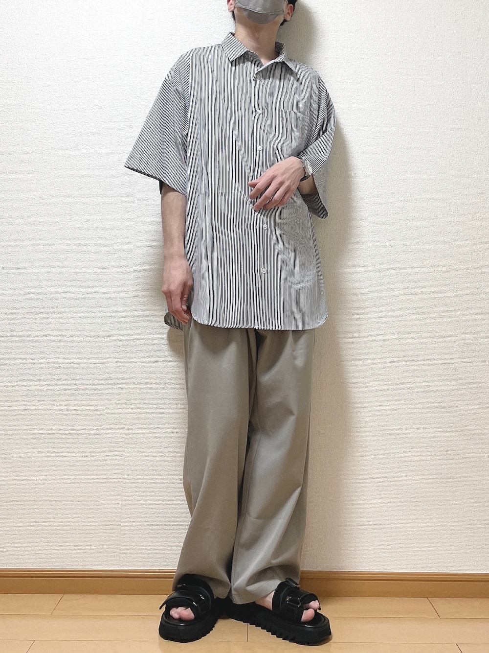 おはようございます😊 今回は 「夏仕様 ストライプシャツコーデ」 半袖ストライプシャツを使って ゆるコーデ🙆♀️ 全体が明るく夏っぽい感じに♪ [サイズ] シャツ L パンツ S サンダル 26