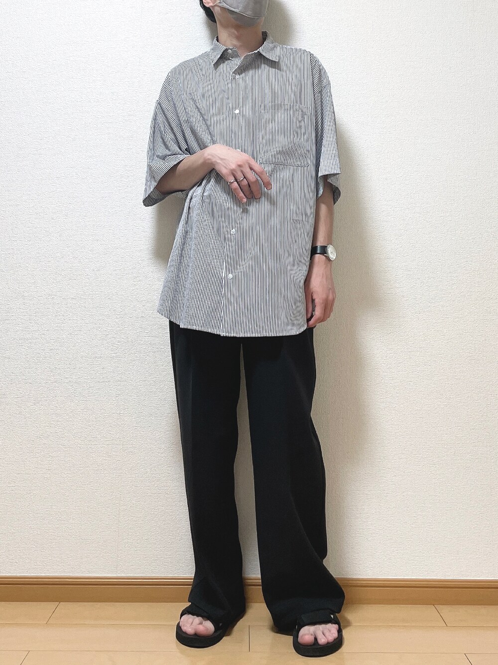おはようございます😊 今回は 「ストライプシャツコーデ」 ストライプシャツを使って シンプルなコーデに👌 柄ものなので黒パンツと合わせると 大人っぽく🙆♀️ [サイズ] シャツ L パンツ S サンダル 26
